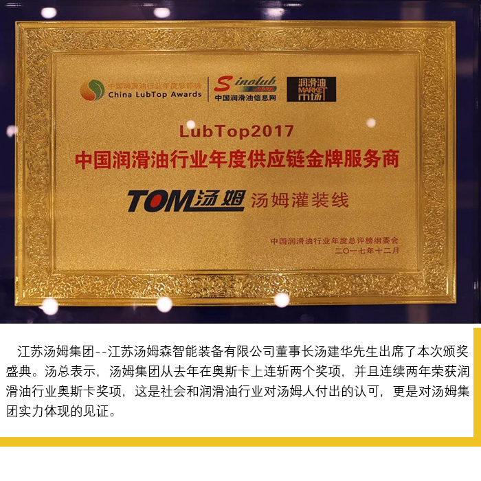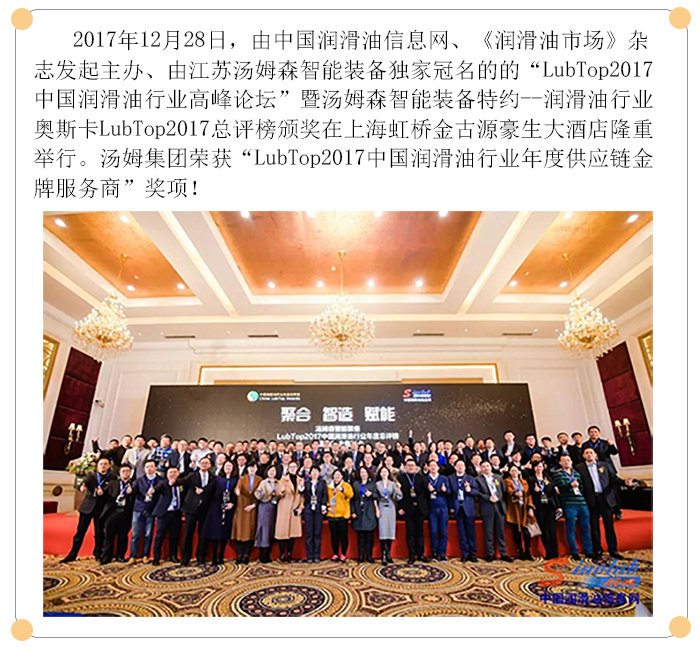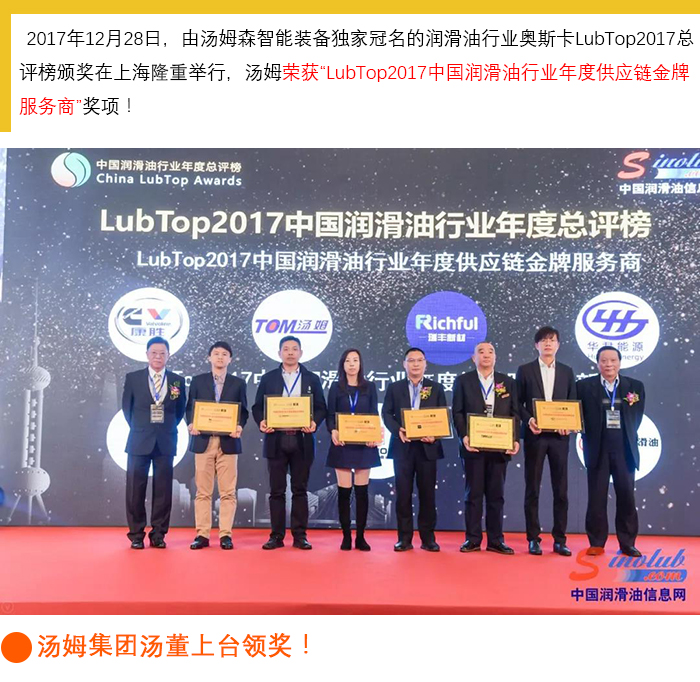 【喜訊】湯姆再次榮獲 LubTop2017中國潤滑油行業(yè)年度供應鏈金牌服務商獎!