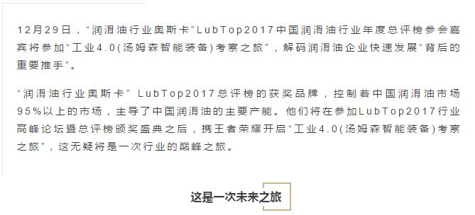 【潤滑油行業總評榜】江蘇湯姆集團獨家冠名Lubtop2017潤滑油總評榜,與您共登方舟,助您快速駛向工業4.0!