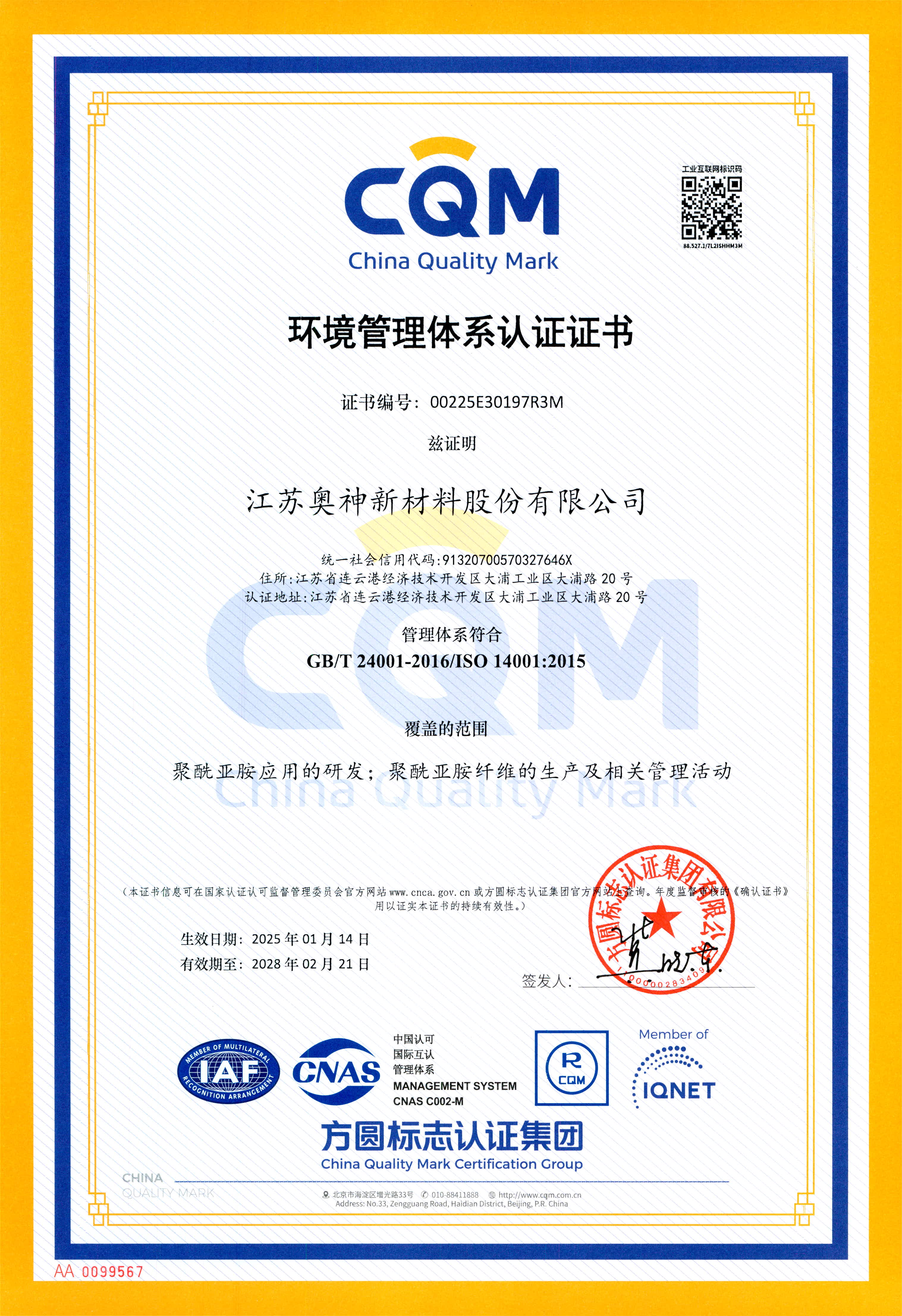 環(huán)境管理體系認證證書