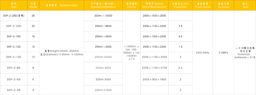 | 生產(chǎn)能力(1L計) | 1800瓶/時 | 2400瓶/時 | 3000瓶/時 | 3600瓶/時 | 4800瓶/時 | 6000瓶/時 |